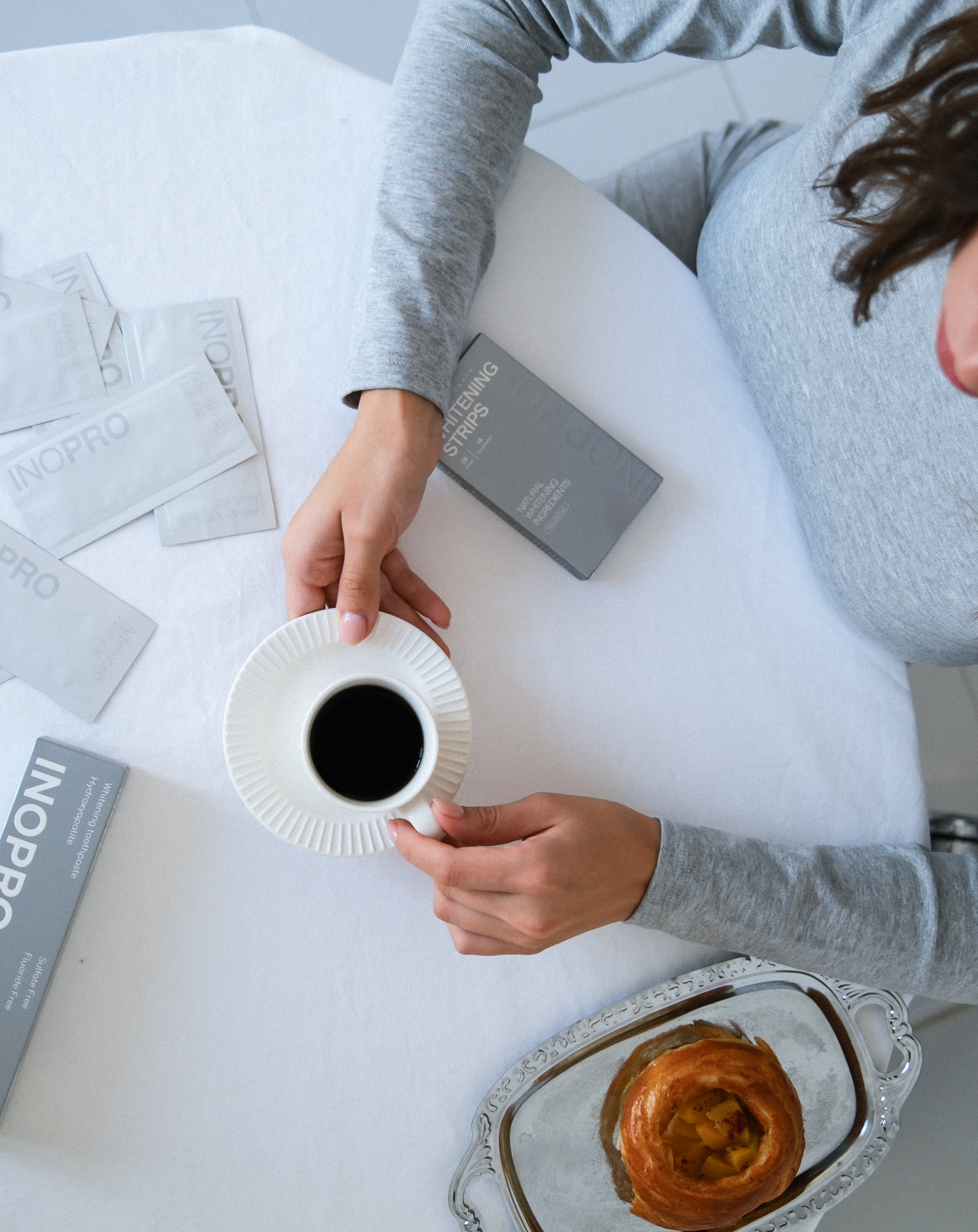 Зубная паста InoPro с пробиотиками и гидроксиапатитом утром и вечером. Отбеливающие полоски для зубов InoPro Advanced 1 в день по ~30 минут — деликатное освежение тона без пероксида.